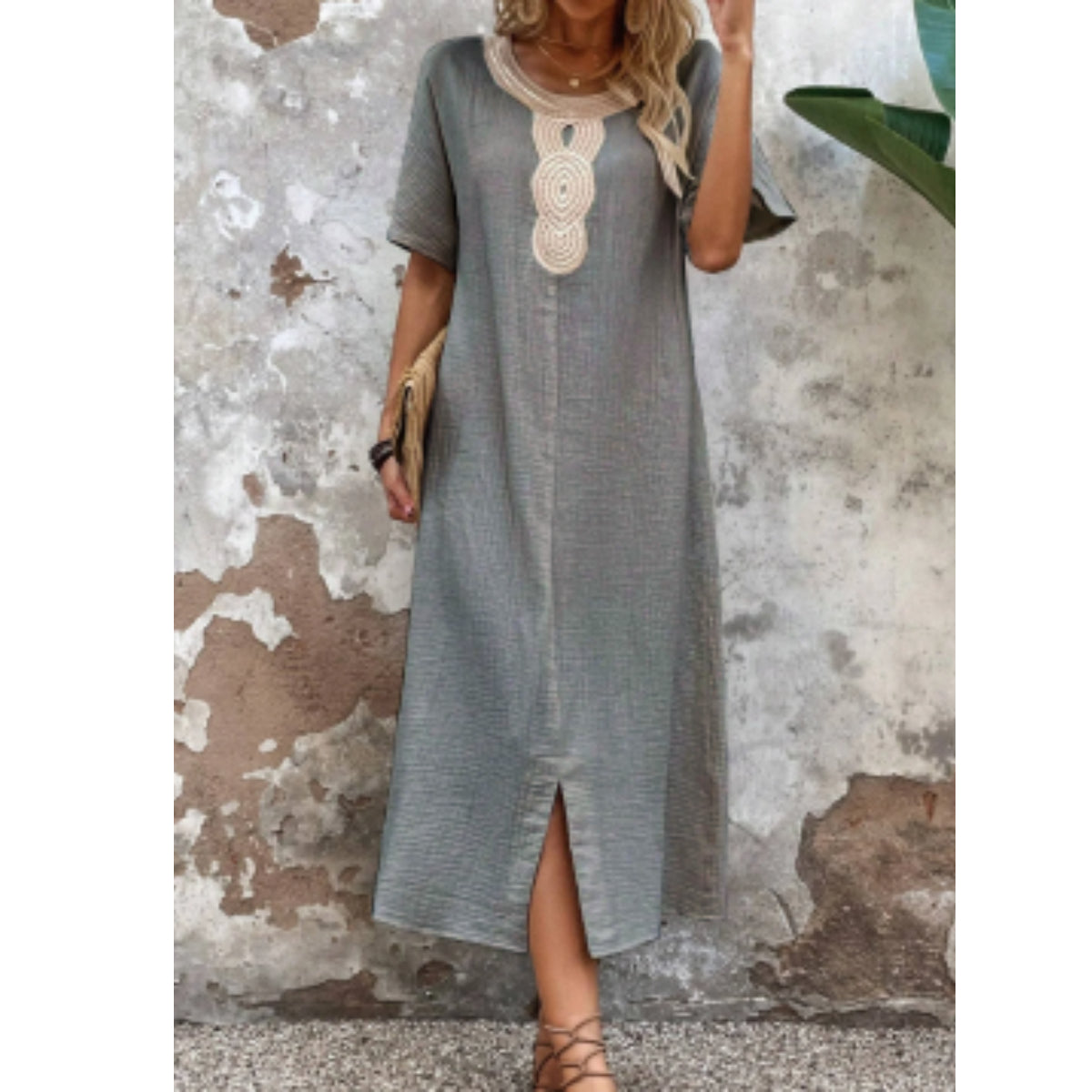 Damska sukienka z bawełny i lnu z okrągłym dekoltem i długą spódnicą